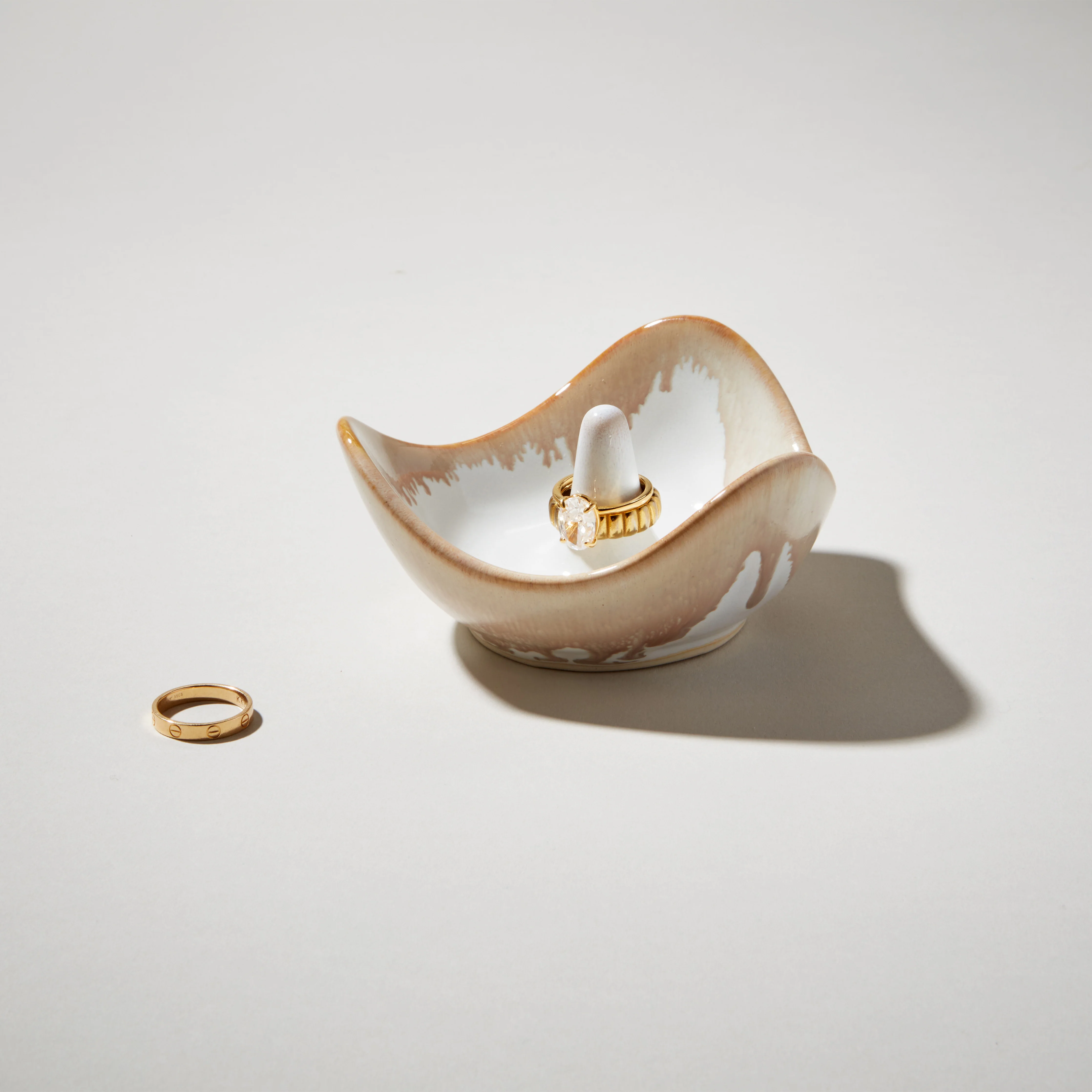 Inspired by our bestselling glass Champlain Ring Holder, this pottery version brings the same softly rounded, three-point form to hand-thrown ceramic. The shape feels intuitive in use and at home on a bedside table, sink, or entryway shelf.
